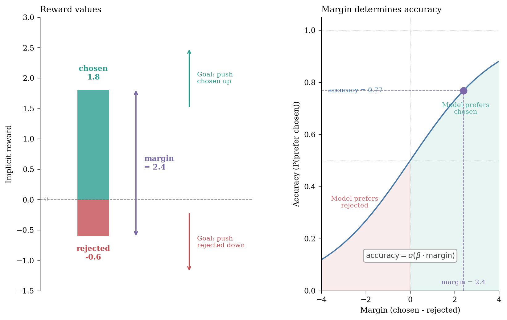 The margin is simply the difference between the chosen and rejected rewards; the preference probability is the sigmoid of that margin (scaled by beta).2 The logged accuracy is the empirical fraction of pairs where the chosen reward exceeds the rejected reward, so it tracks the sigmoid in expectation. As training progresses, we want the margin to increase – either by pushing the chosen reward up, the rejected reward down, or both. A larger margin means higher accuracy, which means the model more reliably prefers the chosen response over the rejected one.