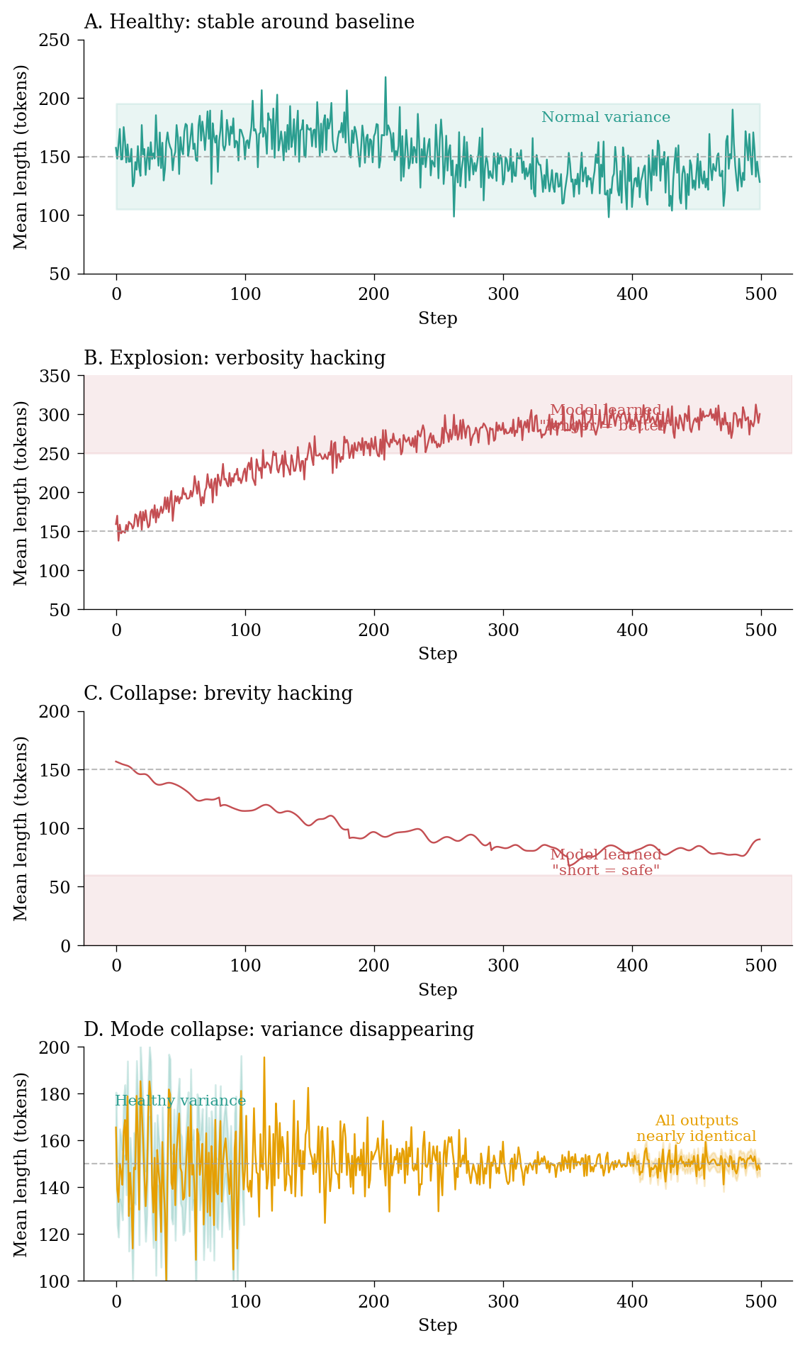 Length variance collapsing: Even if mean length stays stable, collapsing variance indicates mode collapse. The model is converging to a single “template” response style. Increase temperature or add entropy bonuses.