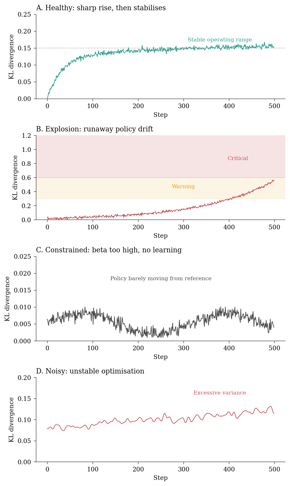 KL suddenly spiking: Often indicates a batch of data that the model handles very differently from the reference. Investigate that batch.