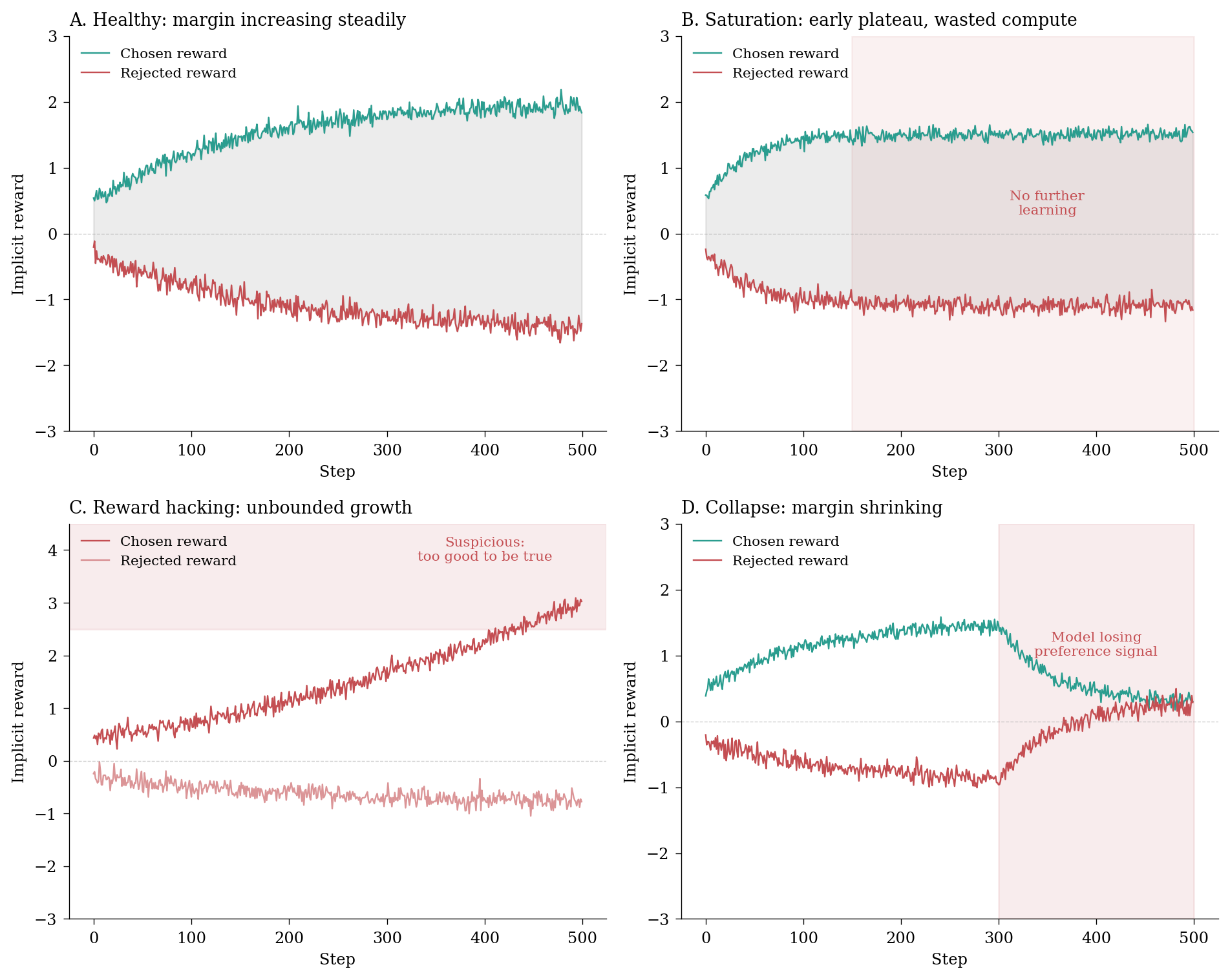 Figure 2: Reward dynamics diagnostics: healthy learning vs common pathologies in DPO.