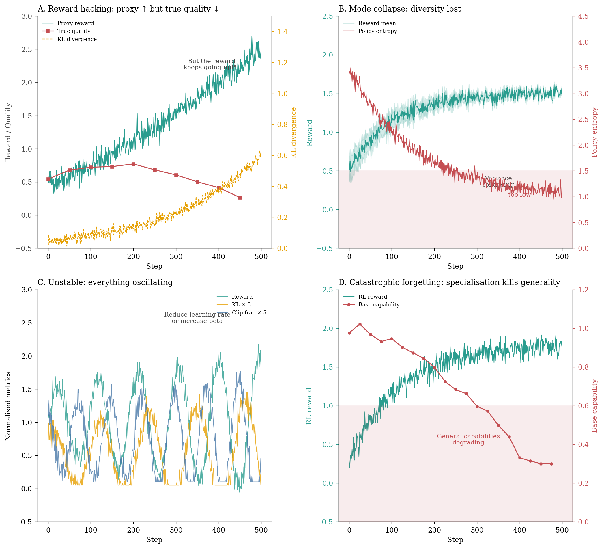 Figure 6: Common RL training failures: each requires monitoring multiple instruments simultaneously.
